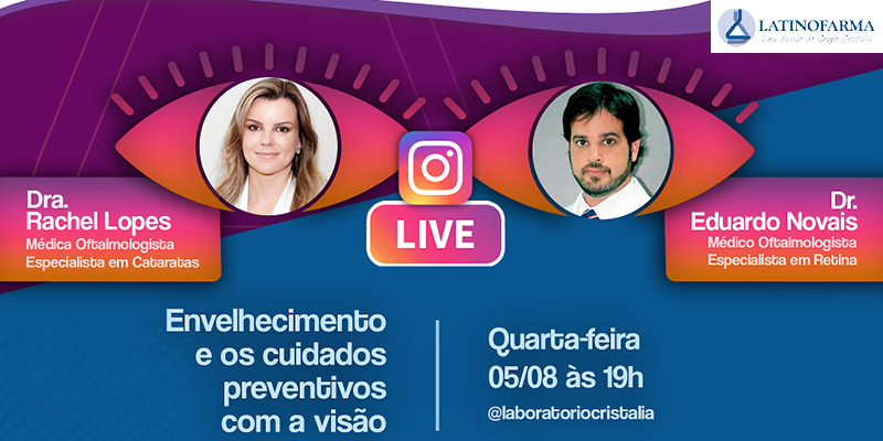 <p><img src="https://www.cristalia.com.br/arquivos/18e3689db54a6c6817fa6e79aaa75d7e.jpg" style="width: 800px;"><span style="color: rgb(105, 105, 105); font-family: Verdana; text-align: justify;"><br></span></p><p style="text-align: center; "><span style="color: rgb(105, 105, 105); font-family: Verdana; text-align: justify;"><br></span></p><p><span style="color: rgb(105, 105, 105); font-family: Verdana; text-align: justify;">Nós temos um convite pra você!</span><br style="box-sizing: inherit; color: rgb(105, 105, 105); font-family: Verdana; text-align: justify;"><br style="box-sizing: inherit; color: rgb(105, 105, 105); font-family: Verdana; text-align: justify;"><span style="color: rgb(105, 105, 105); font-family: Verdana; text-align: justify;">No próximo dia 05 de agosto, quarta-feira, às 19h, teremos uma live com os médicos oftalmologistas dra. Rachel Lopes, especialista em catarata, e o dr. Eduardo Novais, especialista em retina.</span><br style="box-sizing: inherit; color: rgb(105, 105, 105); font-family: Verdana; text-align: justify;"><br style="box-sizing: inherit; color: rgb(105, 105, 105); font-family: Verdana; text-align: justify;"><span style="color: rgb(105, 105, 105); font-family: Verdana; text-align: justify;">Durante o papo, os profissionais vão falar sobre o Envelhecimento e os cuidados preventivos com a visão. O encontro é no Instagram @laboratoriocristalia.</span><br style="box-sizing: inherit; color: rgb(105, 105, 105); font-family: Verdana; text-align: justify;"><br style="box-sizing: inherit; color: rgb(105, 105, 105); font-family: Verdana; text-align: justify;"><span style="color: rgb(105, 105, 105); font-family: Verdana; text-align: justify;">Participe, mande sua pergunta, envie seu comentário durante a live.</span><br style="box-sizing: inherit; color: rgb(105, 105, 105); font-family: Verdana; text-align: justify;"><br style="box-sizing: inherit; color: rgb(105, 105, 105); font-family: Verdana; text-align: justify;"><span style="color: rgb(105, 105, 105); font-family: Verdana; text-align: justify;">O evento é uma realização da Comunicação Interna e Divisão Latinofarma.</span><br style="box-sizing: inherit; color: rgb(105, 105, 105); font-family: Verdana; text-align: justify;">