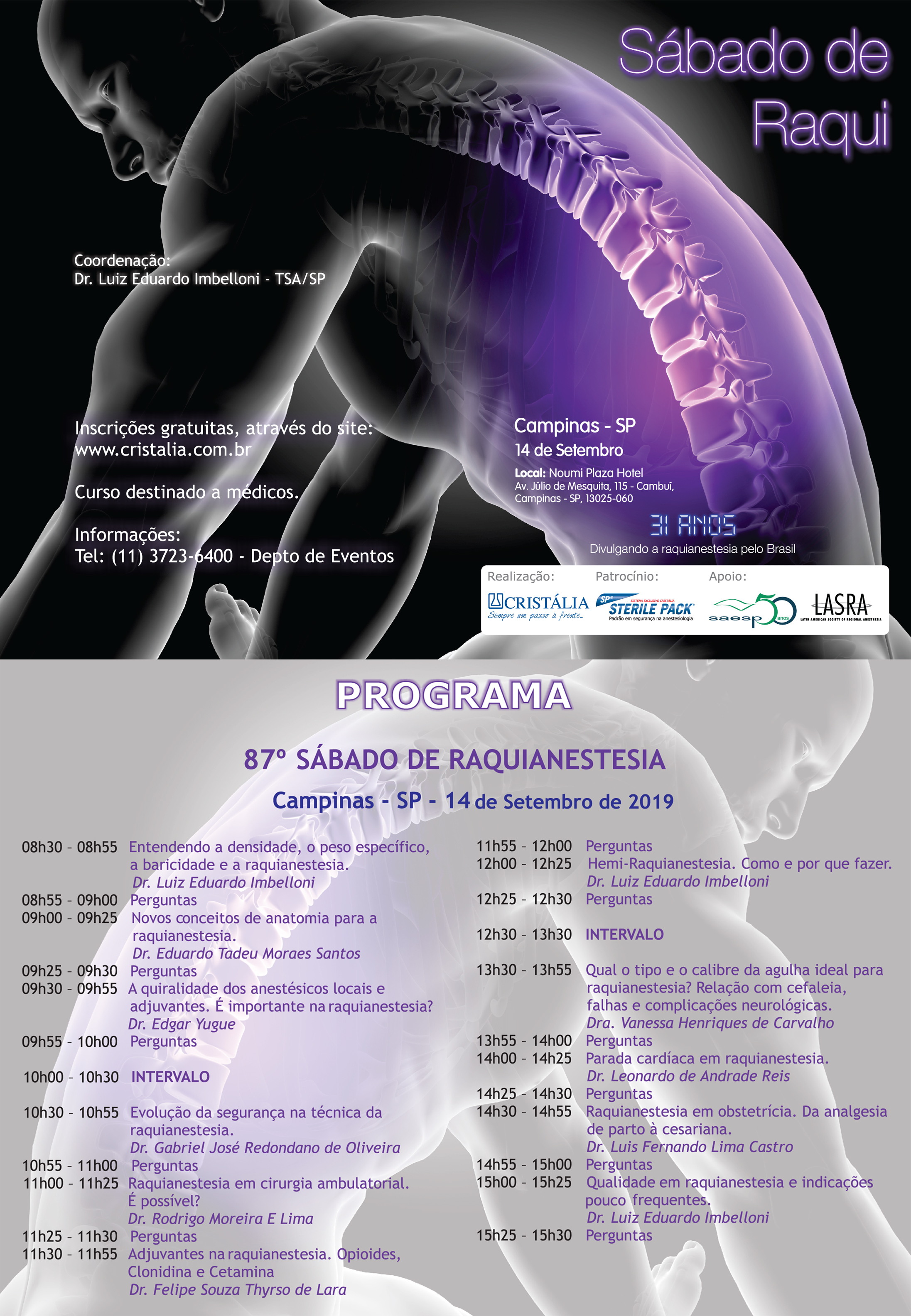 O Laboratório Cristália promove o 87º Sábado de Raqui, no dia 14 de setembro de 2019 na cidade de Campinas/SP. Confira abaixo a programação do Sábado de Raquianestesia da cidade de Campinas.